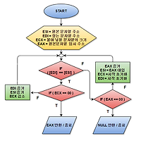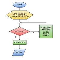 1. strcpy 어셈블리 구현 [strcpy 순서도] [strcpy 어셈블리 소스] ECX에 원본 문자열의 크기 값이 대입되어 REP MOVS 명령어가 ECX 크기만큼 반복 실행된다. strcpy함수와 같은 위 어셈블리 코드를 실행하면 Null로 초기화 되어 있던 destStr 배열안에 srcStr 문자열을 복사하여 넣을 수 있다. 배열 크기가 넉넉하기 때문에 문제점을 찾을 수 없지만 원본 크기가 사본 배열크기보다 클 경우 buffer overflow 취약점이 생길 수 있다. 사본 배열의 공간크기를 검증하지 않고 수행되기 때문에 크기에 관계없이 반복하여 메모리에 값을 넣어버린다. 2.1 strcpy 동적 디버깅 분석 1 [strcpy 디버깅] 그림과 같이 ECX 에 0x0000000C (12) 값이 들..