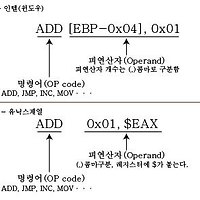 어셈블리어 명령어(Opcode) INCoperand 값이 1 증가 INC reg ex) INC EAX INC mem ex) INC [EBP-0x04] DECoperand 값이 1 감소 DEC reg ex) DEC EAX DEC mem ex) DEC [EBP-0x04] ADD(a+=b 와 동일)두 operand 값을 더해첫번째 operand 값에 저장.-첫번째 operand 에 상수가 올 수 없음 ADD reg, reg ex) ADD EAX, EBX ADD mem, reg ex) ADD [EBP-0x04] EAX ADD reg, mem ex) ADD EBX, [EBP-0x08] ADD reg, imm ex) add ECX, 0x05 ADD mem, imm ex) ADD [EBP-0x04], 0x04 SUB..