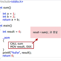 어셈블리 언어 명령어와 Operand 표시기호설명 mem메모리 label지정된 레이블 imm즉시 값(상수) reg 범용 레지스터 label = JMP 사용시 위치값 필요.INC = 인크리먼트 ( Operand 값을 1만큼 증가 ) [] 대괄호는 C언어에서 역참조(*)와 같은 역할.C언어에서 PTR을 안써주면 컴파일할때 1byte만 읽는다.ex) DWORD PTR[EBP-4] : EBP-4 부터 DWORD만큼 역참조해서 읽겠다. 인라인어셈상위레벨언어에서(C언어) 어셈블리언어를 사용할때 사용.상위레벨언어의 변수를 사용 가능하다.ex) int main(){ int a=0; _asm { INC a INC a } //